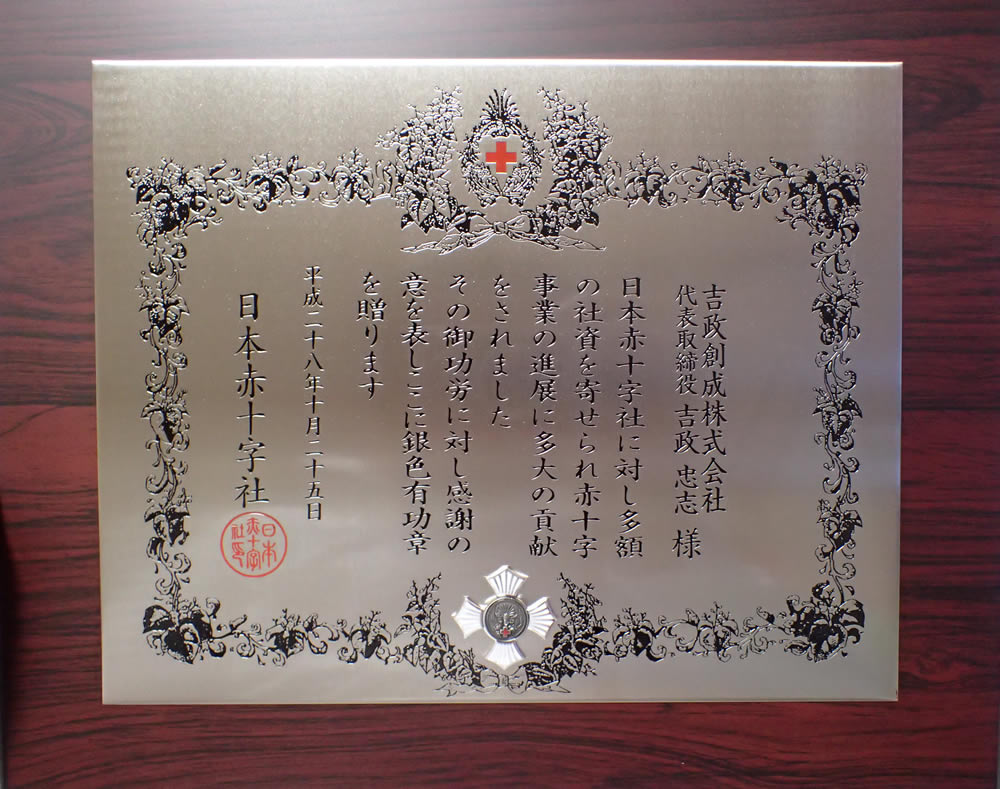 2016年10月25日 明治神宮記念会館で開催された日本赤十字東京都大会にて名誉副総裁の高円宮妃殿下より直接、盾とバッジを賜り、当社代表が銀色有功章を受章しました。引き続き微力ながら日本赤十字社の活動を支援いたします。