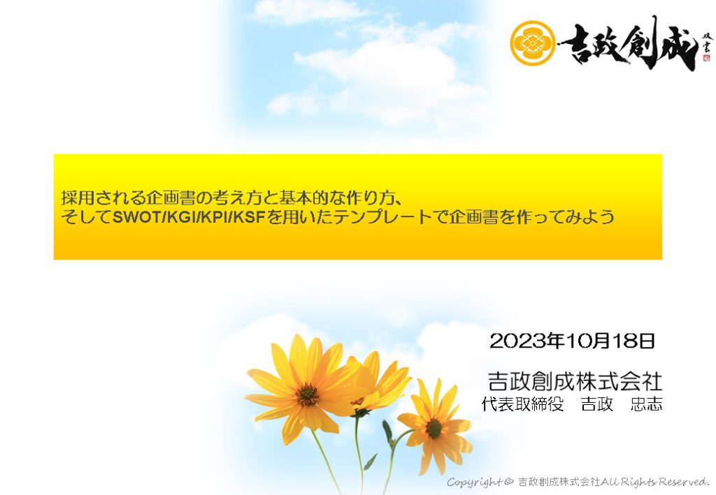 「採用される企画書の考え方と基本的な作り方、そしてSWOT/KGI/KPI/KSFを用いたテンプレートで企画書を作ってみよう」に代表の吉政忠志が登壇します。