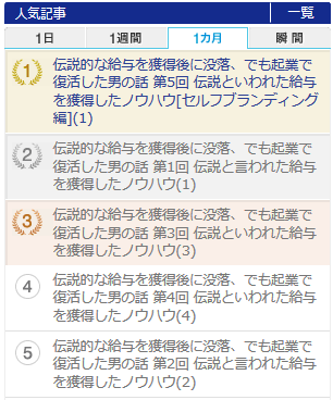 マイナビで連載している自叙伝的コラムが月間アクセスランキングで1位から5位まで独占となりました。 お読みになった皆様、ありがとうございました。 大変好評のコラムです。興味がある方は、以下をご覧ください。 http://news.mynavi.jp/column/secretofs... -